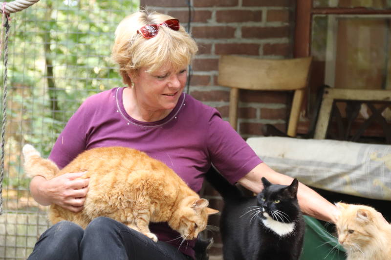 Ik werk twee dagen in de week als vrijwilliger bij Stichting Kattendorp te Harfsen waar zo'n 180 niet herplaatsbare katten worden opgevangen (zie de foto's). Natuurlijk zijn niet al de 180 katten knuffelbaar, er zijn ook dieren bij die niet gesocialiseerd zijn met mensen en liever afstand houden. De katten verblijven in Kattendorp tot hun dood. De verzorging komt neer op de beheerster van Kattendorp, haar partner, vrijwilligers en stagiaires.